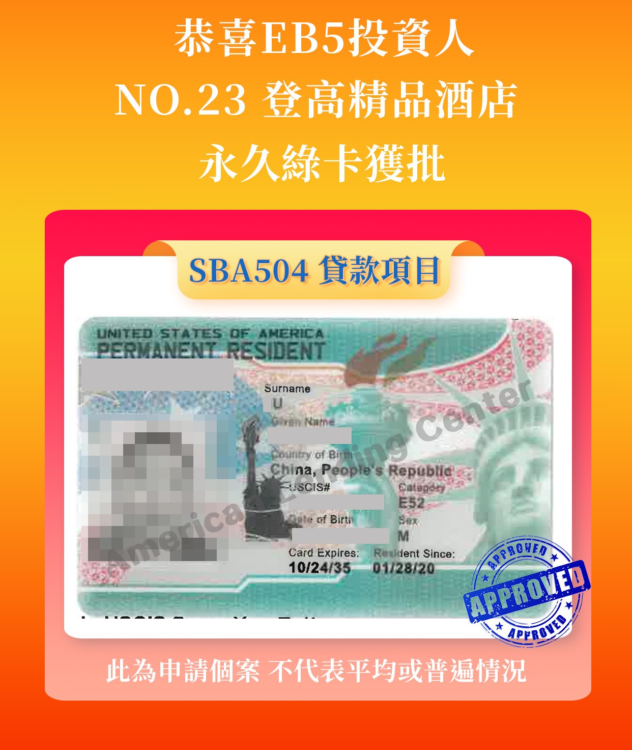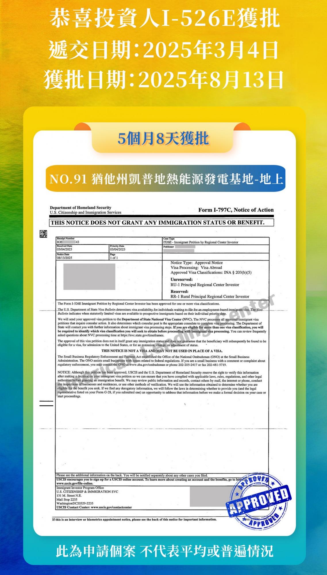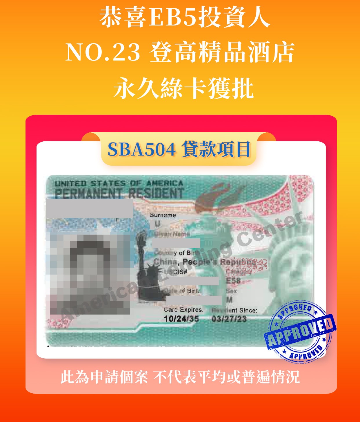 文中所述核准個案的審理速度僅代表該個案的特殊情況,不應被解讀為同類案件普遍適用的規律,更不能代表本公司(American Lending Center,簡稱「ALC」)客戶整體案件的平均審理速度。個案審批速度的過度分析或解讀毫無意義。 ALC在此明確聲明:對於因公眾或第三人對個案審批速度進行過度解讀、誤解或由此產生的任何後果,ALC概不承擔任何責任。