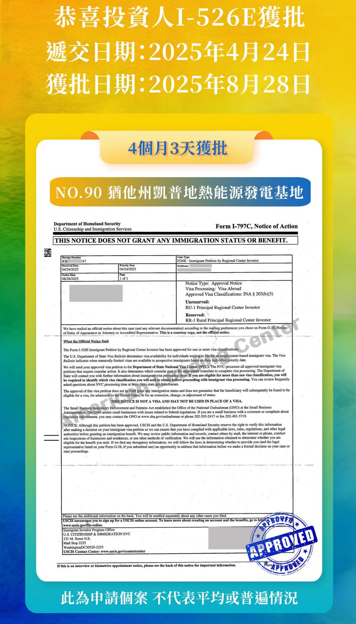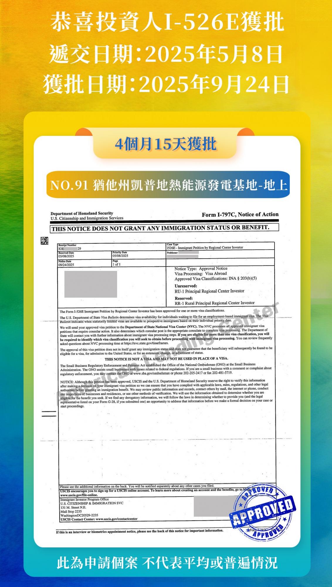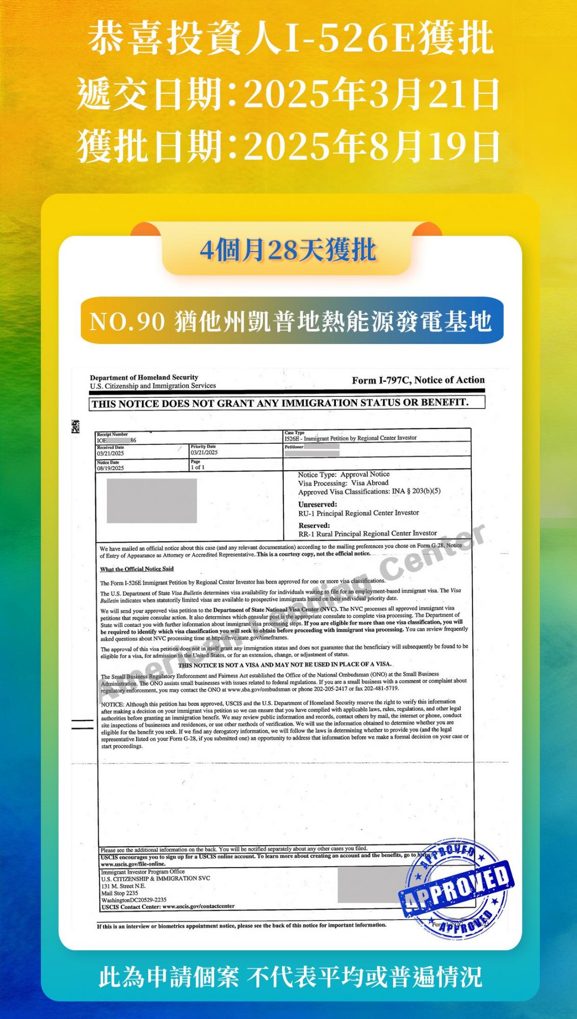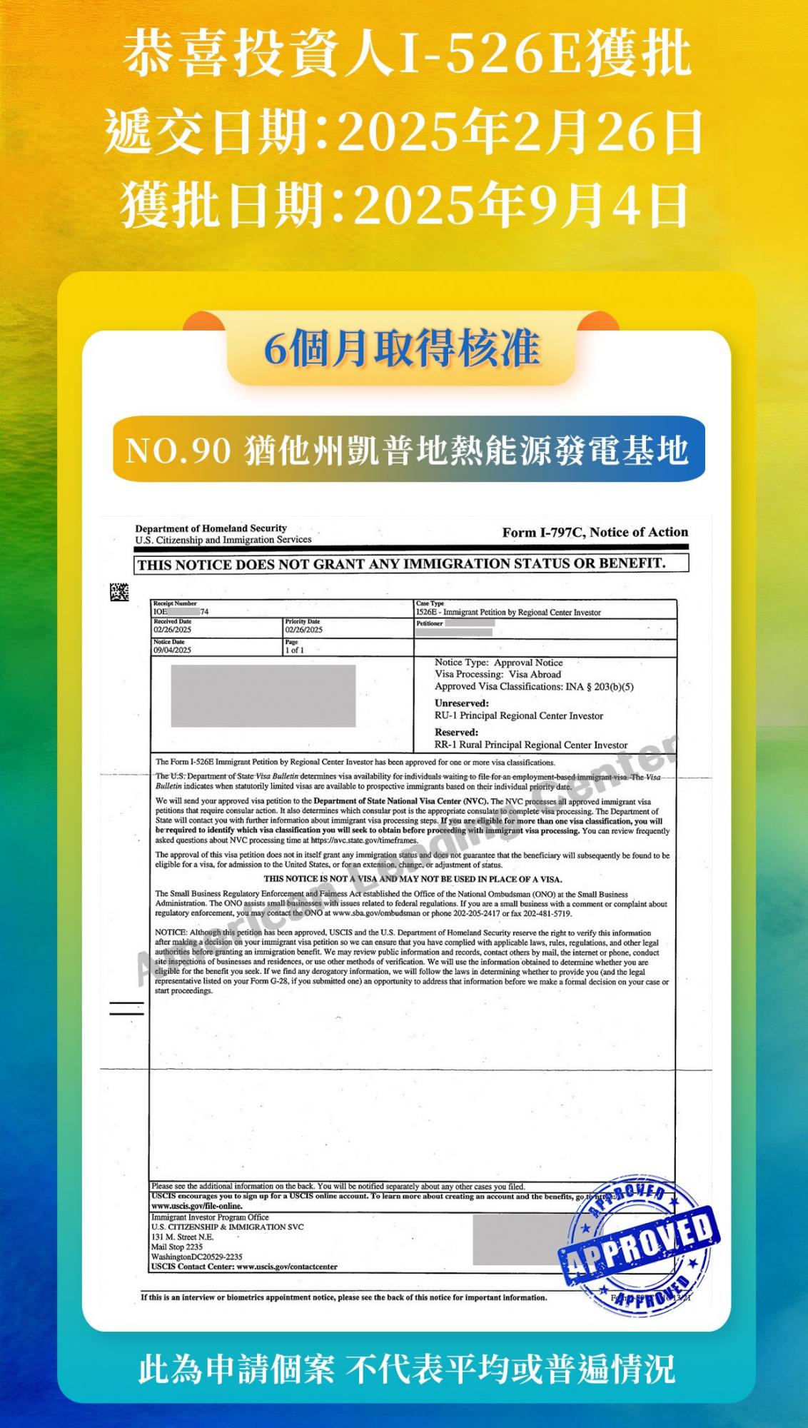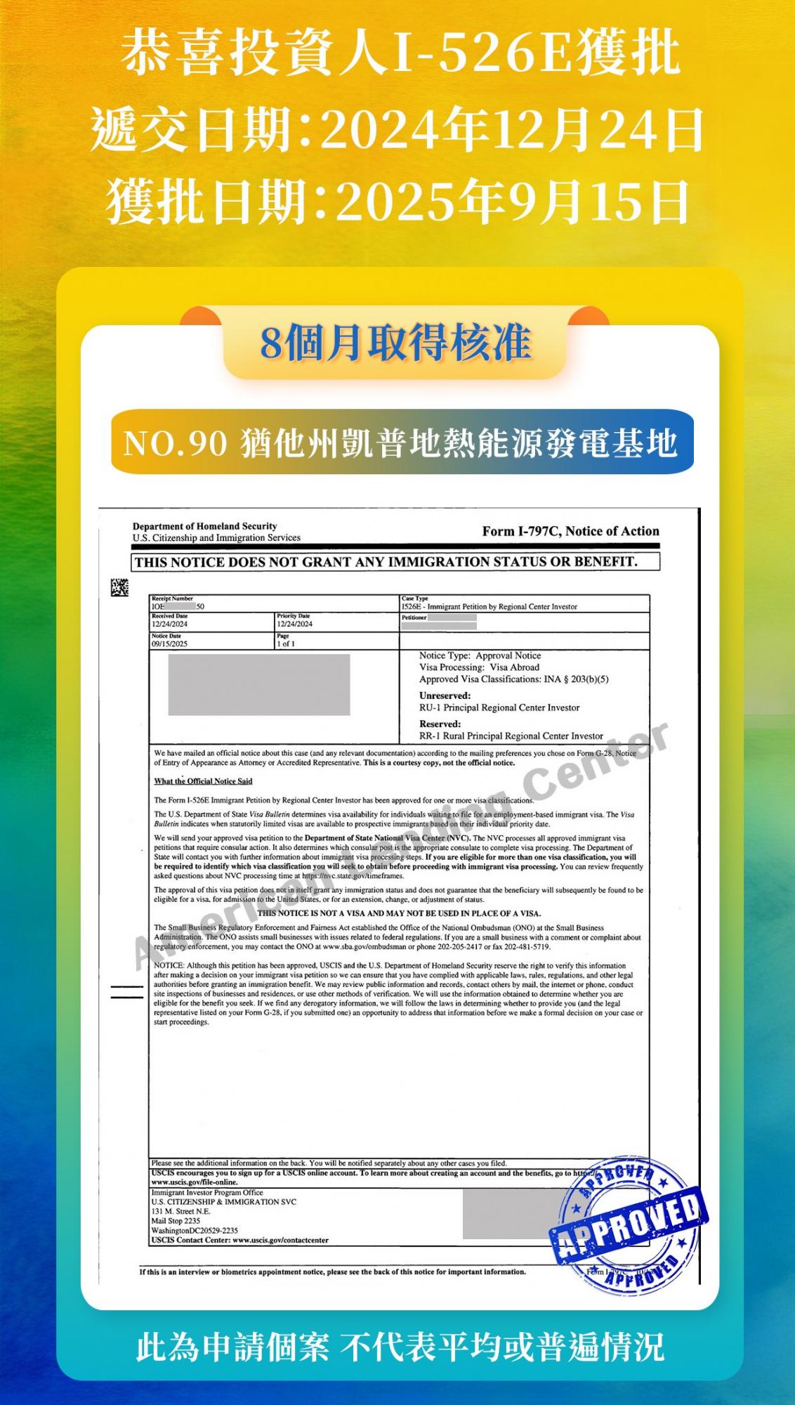 好消息繼續!恭喜ALC鄉村項目No.91猶他州凱普地熱能源發電基地-地上投資人順利獲得I-526E批准,我們期待其他投資人獲批的好消息,並將第一時間與您分享。