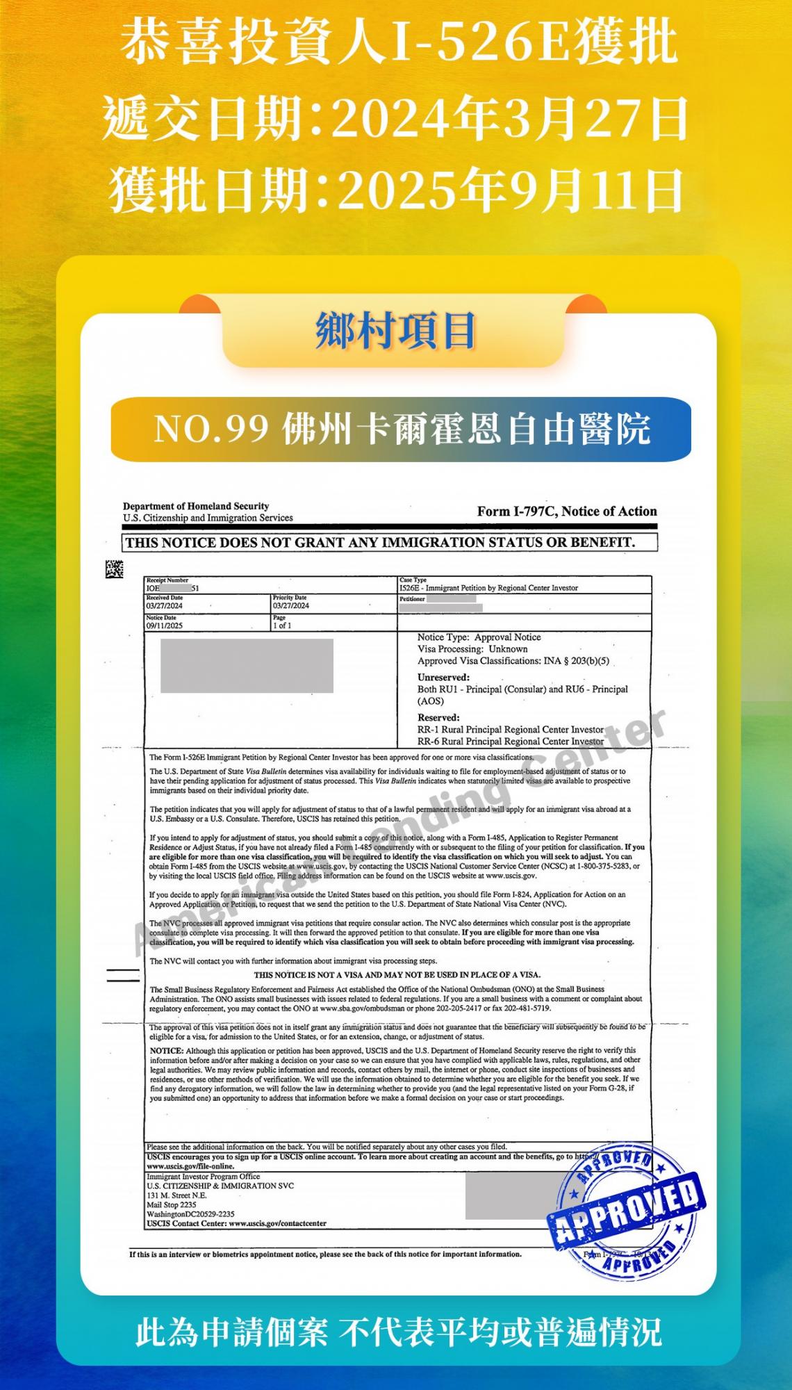 緊接著,恭喜ALC鄉村項目No.99佛州卡爾霍恩自由醫院投資人I-526E批准,恭喜投資人!期待其他投資人獲批的好消息,並將第一時間與您分享。