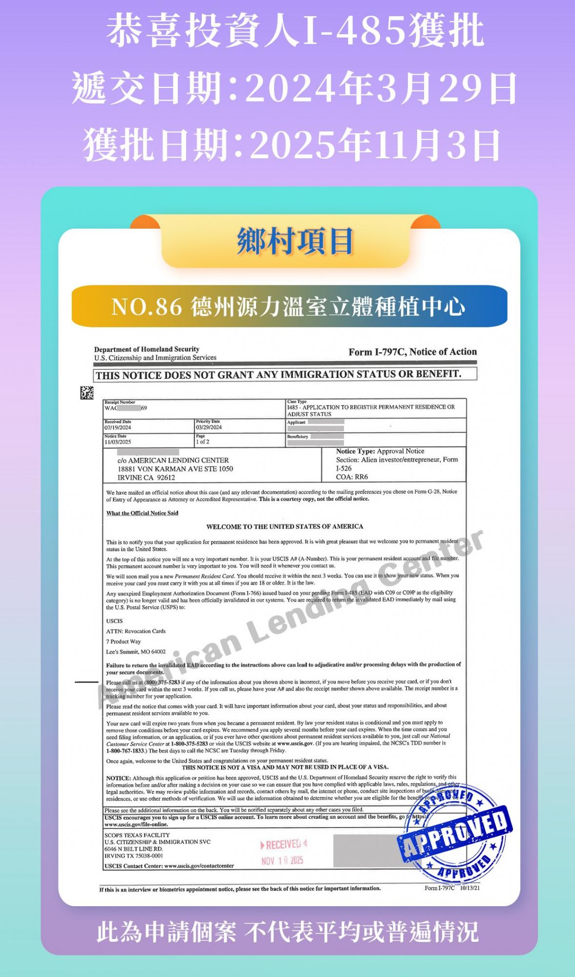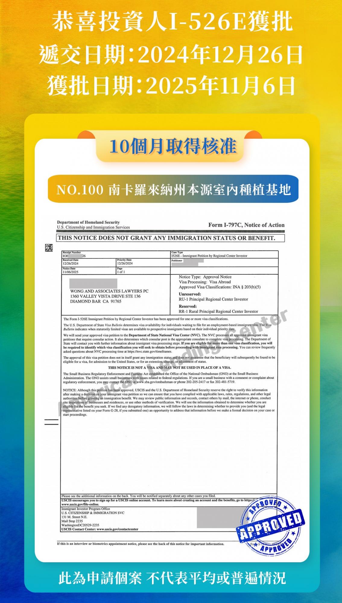 好消息繼續!恭喜ALC鄉村項目No.100南卡羅來納州本源室內種植基地投資人I-526E批准,恭喜投資人!期待其他投資人獲批的好消息,並將第一與您分享。