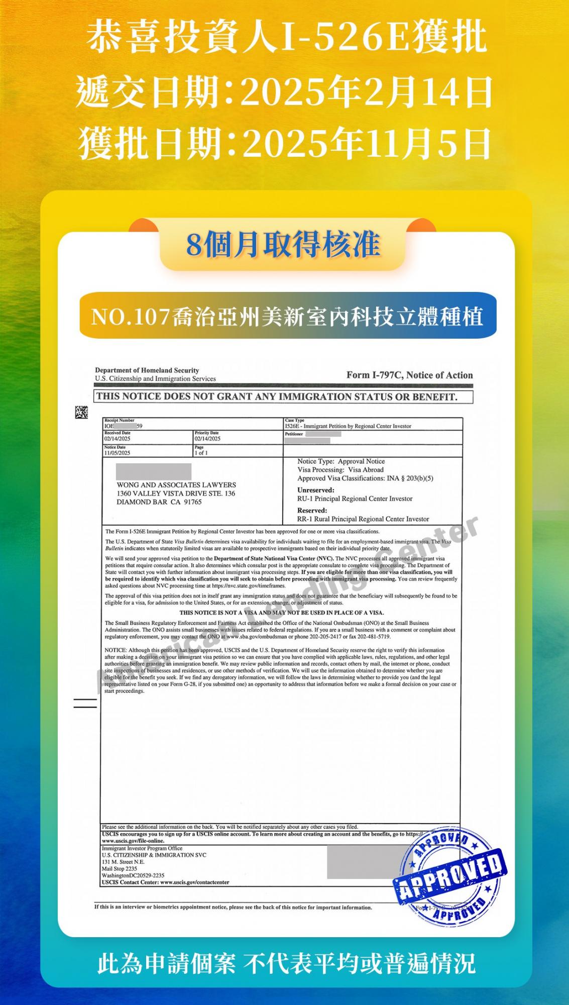 恭喜ALC鄉村項目No.107喬治亞美新室內科技立體種植投資人I-526E批准,恭喜投資人!期待其他投資人獲批的好消息,並將第一時間與您分享。