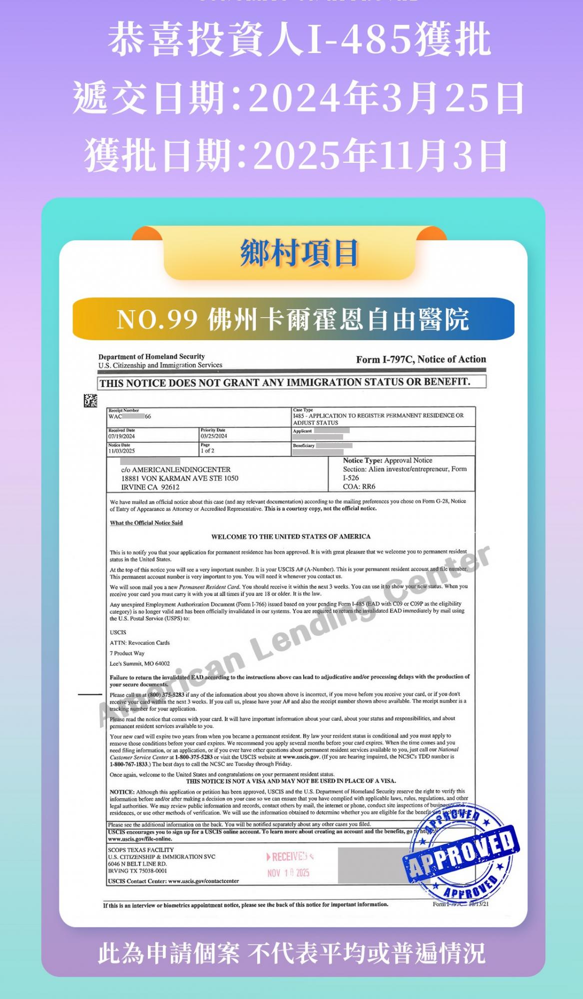 緊接著,恭喜ALC鄉村項目No.99佛州卡爾霍恩自由醫院投資人I-485批准,恭喜投資人!期待其他投資人獲批的好消息,並將第一時間與您分享。